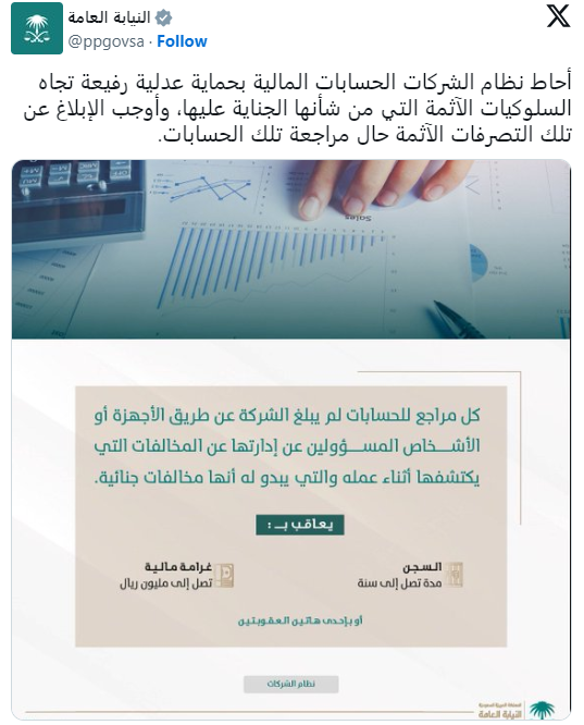 النيابة العامة عقوبة بالسجن لمدة سنة وغرامة مليون ريال لمراجع الحسابات في تلك الحالة